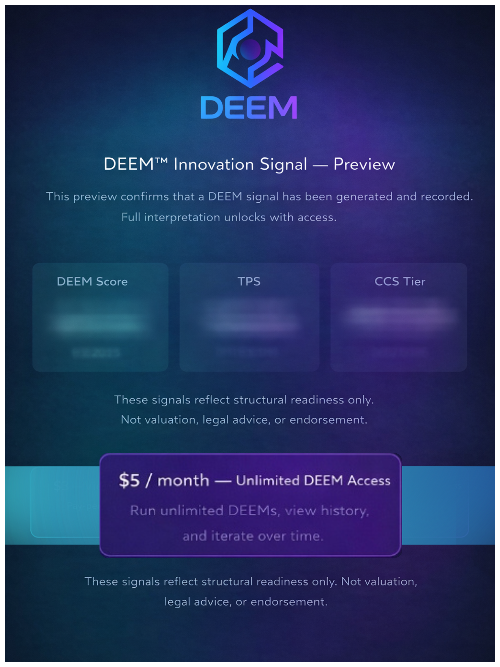 DEEM reflects structural readiness only. Not valuation, legal advice, or endorsement.